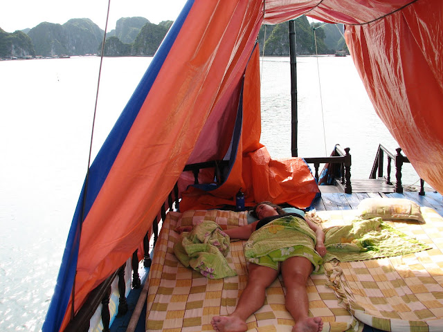 Top deck was great for lounging... and was also where we SLEPT! Under a tarp, in the rain. Yeah, Junk Boat is right!